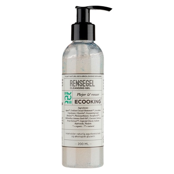 Ecooking rensegel er formuleret med E-vitamin, der beskytter huden mod frie radikaler, så pigmentforandringer og tidlige aldringstegn mindskes. Derudover holder rensegelen din hud fugtet, da den indeholder økologisk solsikke- og mandelolie.