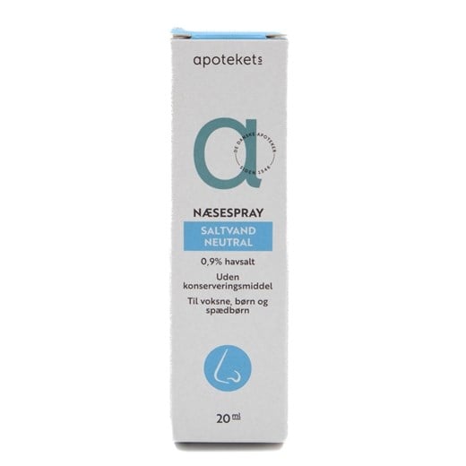 20 ml Apotekets Næsespray Neutral kan anvendes af babyer, børn og voksne ved tilstoppet næse og tørre næseslimhinder på grund af forkølelse, allergi, tørt indeklima, forurening eller lignende.- Indeholder 0,9% saltvand, som er den samme koncentration, som findes naturligt i kroppen.