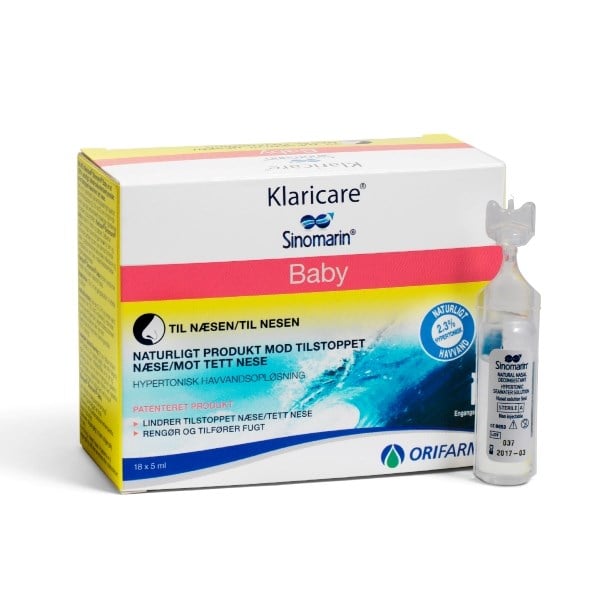 Klaricare® Sinomarin® Baby er skånsomme engangspipetter mod tilstoppet næse til nyfødte og babyer. I forhold til isotoniske saltvandsopløsninger med 0,9% saltopløsning, så har Klaricare® Sinomarin® en ekstra virkning, idet den lindrer tilstoppet næse via en naturlig mekanisme kaldet osmose, hvor overskydende væske i de hævede næseslimhinder trækkes ud, så hævelsen i næsen lettes.