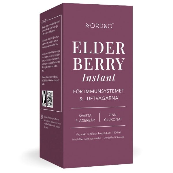 NORDBO elderberry instant er et flydende kosttilskud med hyldebærekstrakt og zinkgluconat, som bidrager til normal funktion af immunsystemet og luftvejene. Kosttilskuddet er med bærsmag og uden tilsat sukker.