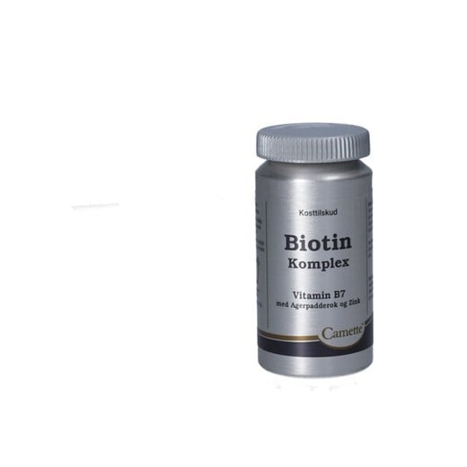 Camette Biotin Komplex er et kosttilskud bestående af tabletter med biotin (vitamin B7), agerpadderok og zink.