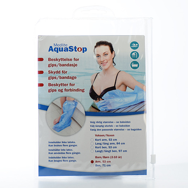 1 stk.Aquastop er en TPE plastpose, der hjælper til beskyttelse af gips eller forbinding ved vandaktivitet som f.eks. brusebad, badning og svømning.