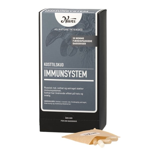NANI Kurpakke Immunsystem er et kosttilskud udviklet med en række nøje udvalgte urter og mælkesyrebakterier til perioder, hvor der målrettet ønskes at støtte immunsystemet og modstandskraften.