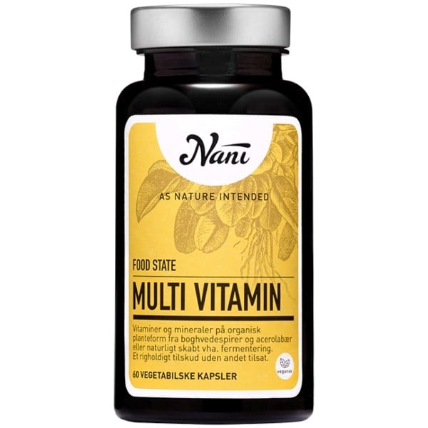 60 stk.Multivitamin Food state fra NANI er et vitamin og mineraltilskud på organisk planteform med vitaminer og organiske mineraler fra boghvedespirer og acerola kirsebær eller naturligt skabt ved hjælp af fermentering.