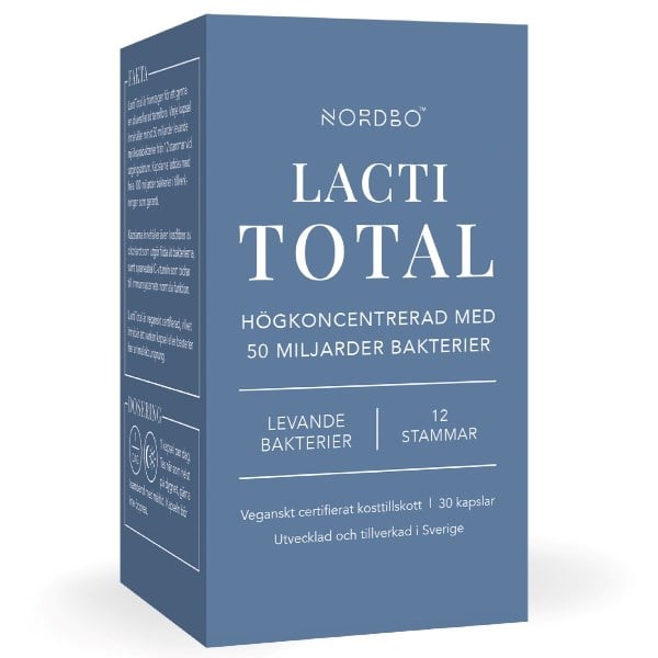 NORDBO lactitotal er et højkoncentreret kosttilskud med mælkesyrebakterier, der indeholder 50 milliarder bakterier fordelt på 12 stammer af Bifido- og Lactobacillus bakterier.