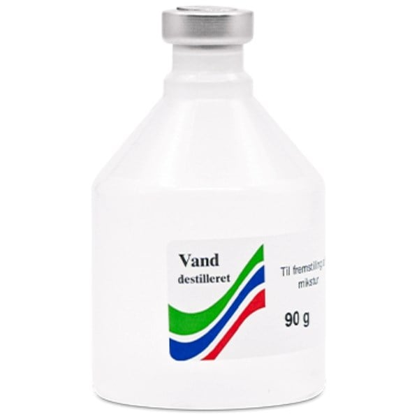 90 gSkan-Medic Destilleret vand til brug ved fremstilling af miksturer. Flasken indeholder en præcis afmålt mængde destilleret vand i en gennemsigtig plastikflaske med forseglet låg.