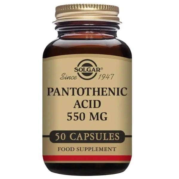 50 stk.Solgar Pantotensyre B5-Vitamin er et kosttilskud i kapselform. Tilskuddet indeholder 550 mg pantotensyre per kapsel og bidrager til et normalt energistofskifte samt bidrager til at mindske træthed og udmattelse. Glasset indeholder 50 stk. vegetabilske kapsler.
